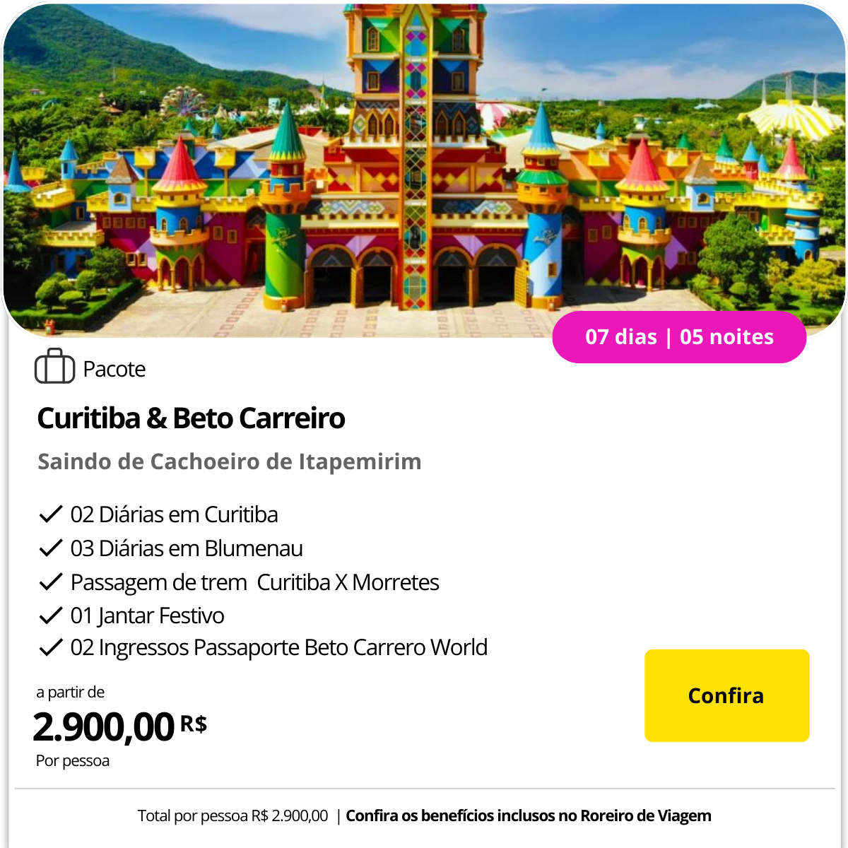 5º Dia 16/01/27 (Sábado) – BETO CARRERO – Após café da manhã, embarque do grupo para o Parque Beto Carrero Word para o segundo dia de emoção e diversão. A tarde, retorno ao hotel. Pernoite.